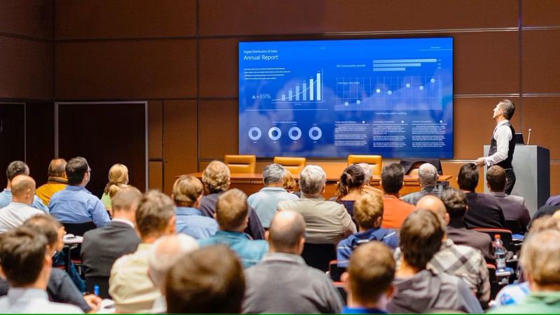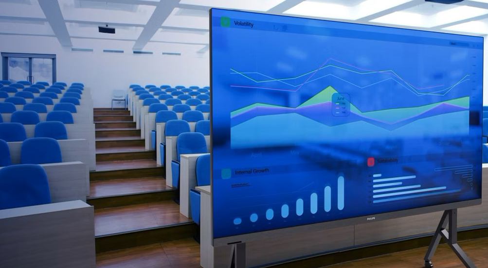 Perfekte Sichtbarkeit auch bei Tageslicht – ohne Abdunkelung. Ideal für PowerPoint-Präsentationen, Videokonferenzen und hybride Meetings. Eine LED-Videowand ersetzt den klassischen Beamer durch eine wartungsarme und leistungsstarke Digitalanzeige.